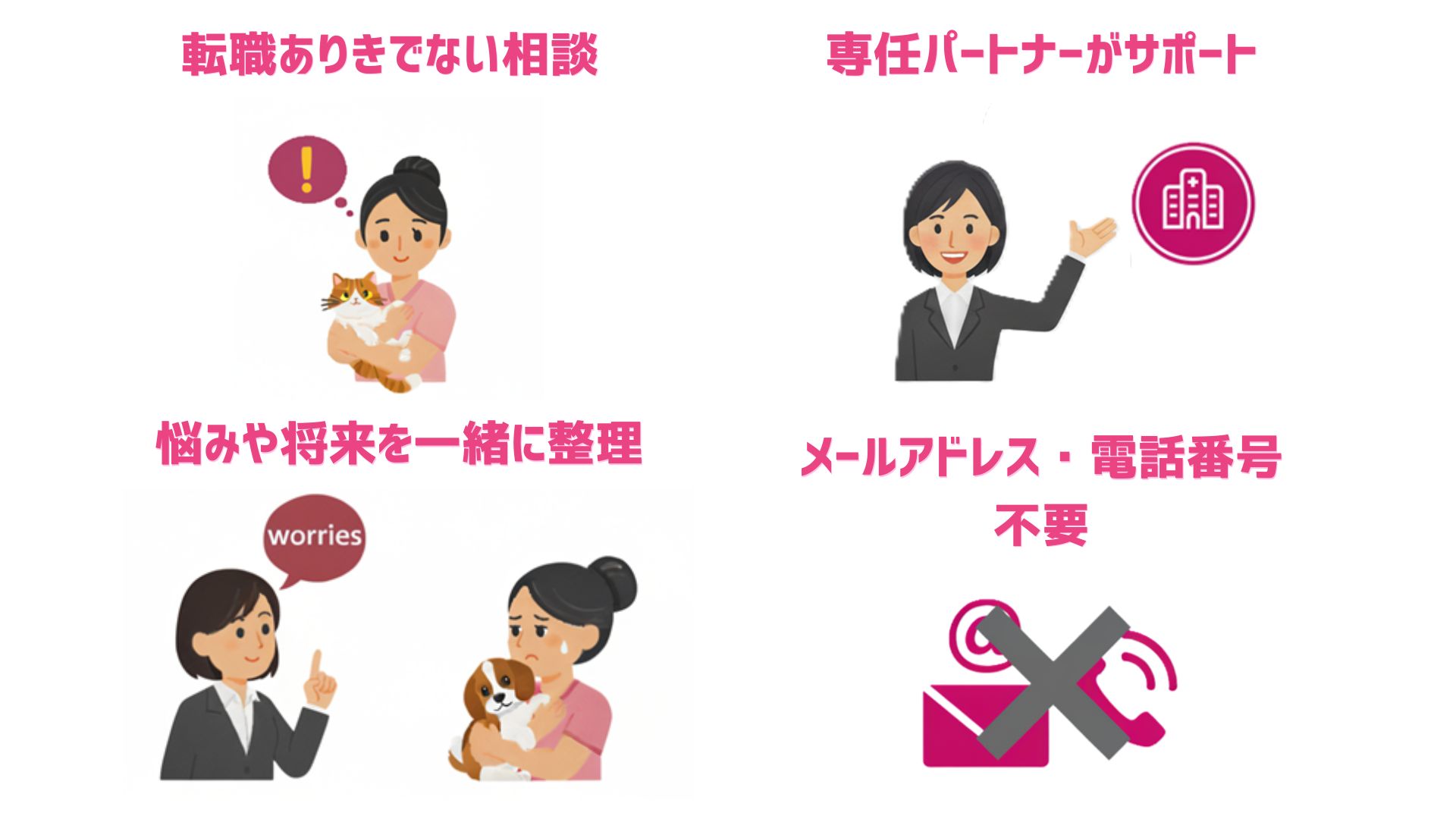 “転職へと進むこと”が目的ではなく、あなたが安心して今後を考えられるように寄り添う相談サービスです。